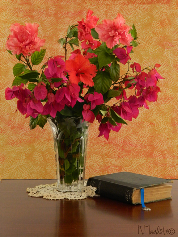 Bonnie has asked us to submit a photograph where we have used one of her textures and used a layer mask to reveal some of the photograph underneath. I have chosen a hibiscus from my garden and Bonnie’s texture “Splendid”. I have desaturated the hibiscus.